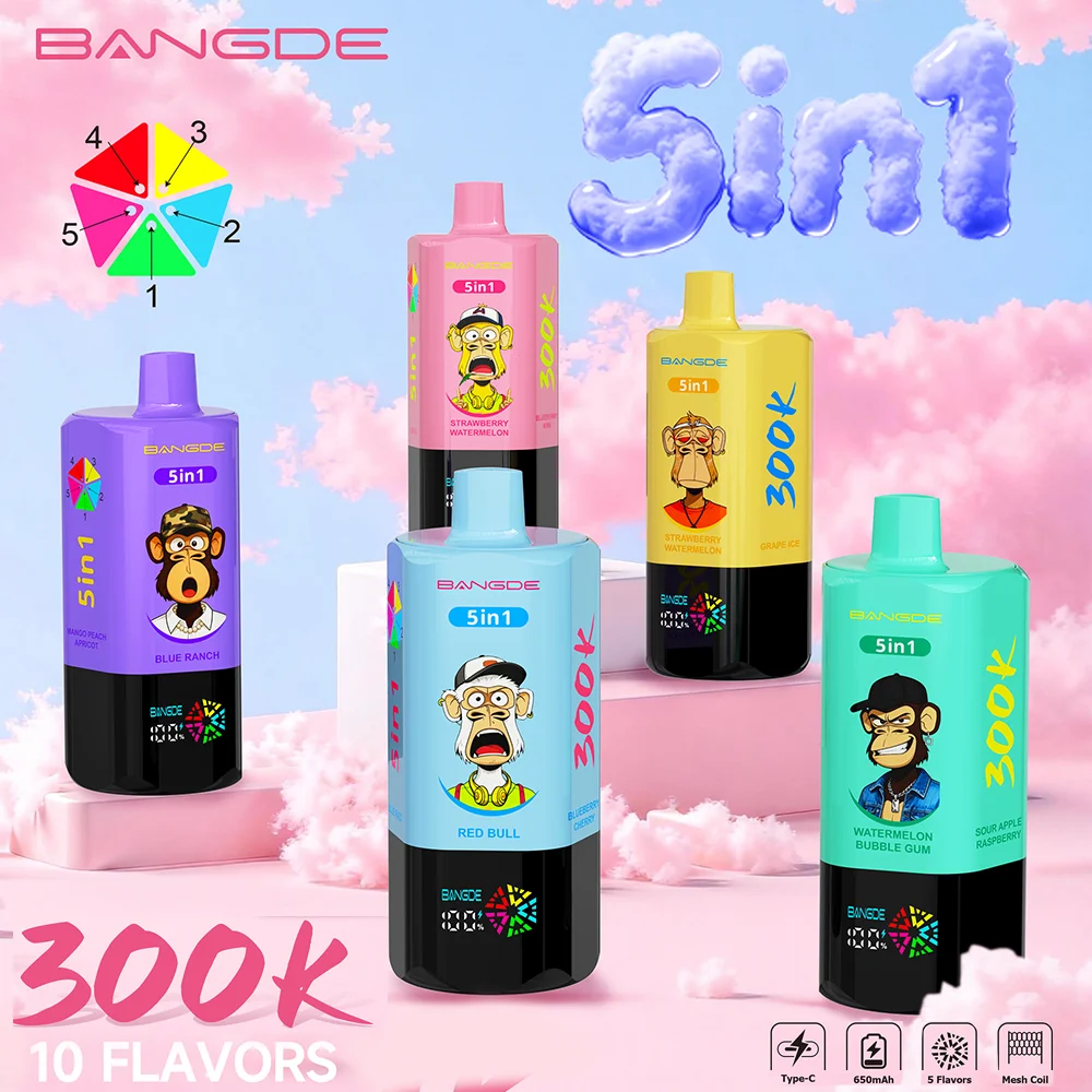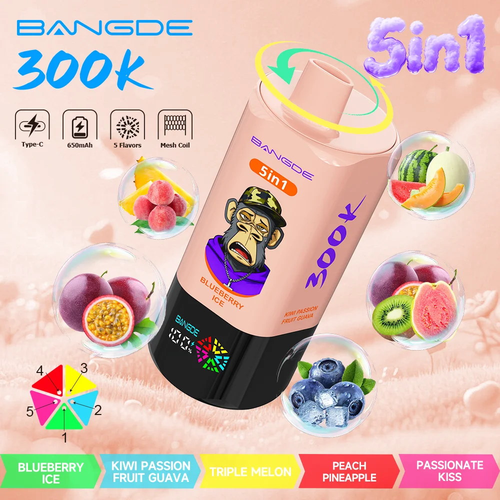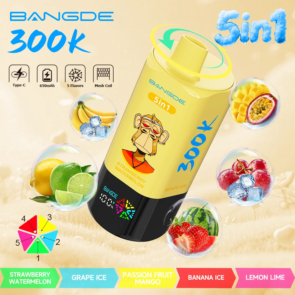 The Bang DE 300000 Puffs 5-in-1 disposable vape featuring a unique rotating flavor switch and iconic Monkey Series designs. Boasting an ultra-large e-liquid capacity of up to 100ml and rich, intense flavors.