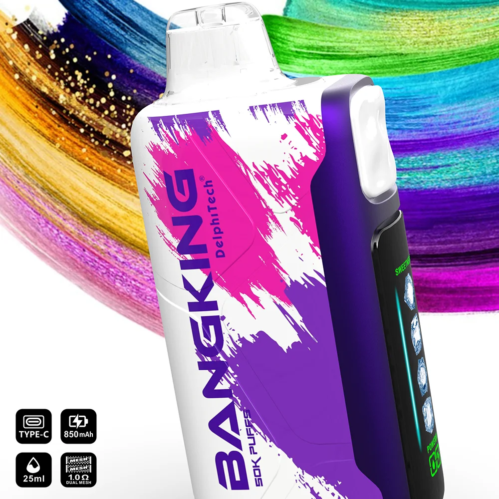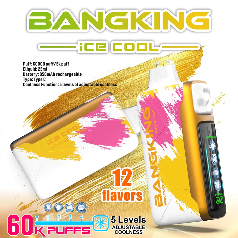 The Bang King 60000-Puff Disposable Vape (Icy Edition) features five adjustable levels of cooling intensity. Equipped with a 1.0Ω Mesh Coil and an 850mAh Type-C battery, it allows users to customize their cooling sensation while enjoying massive clouds and rich flavor. Available in 12 premium flavors, Order now.