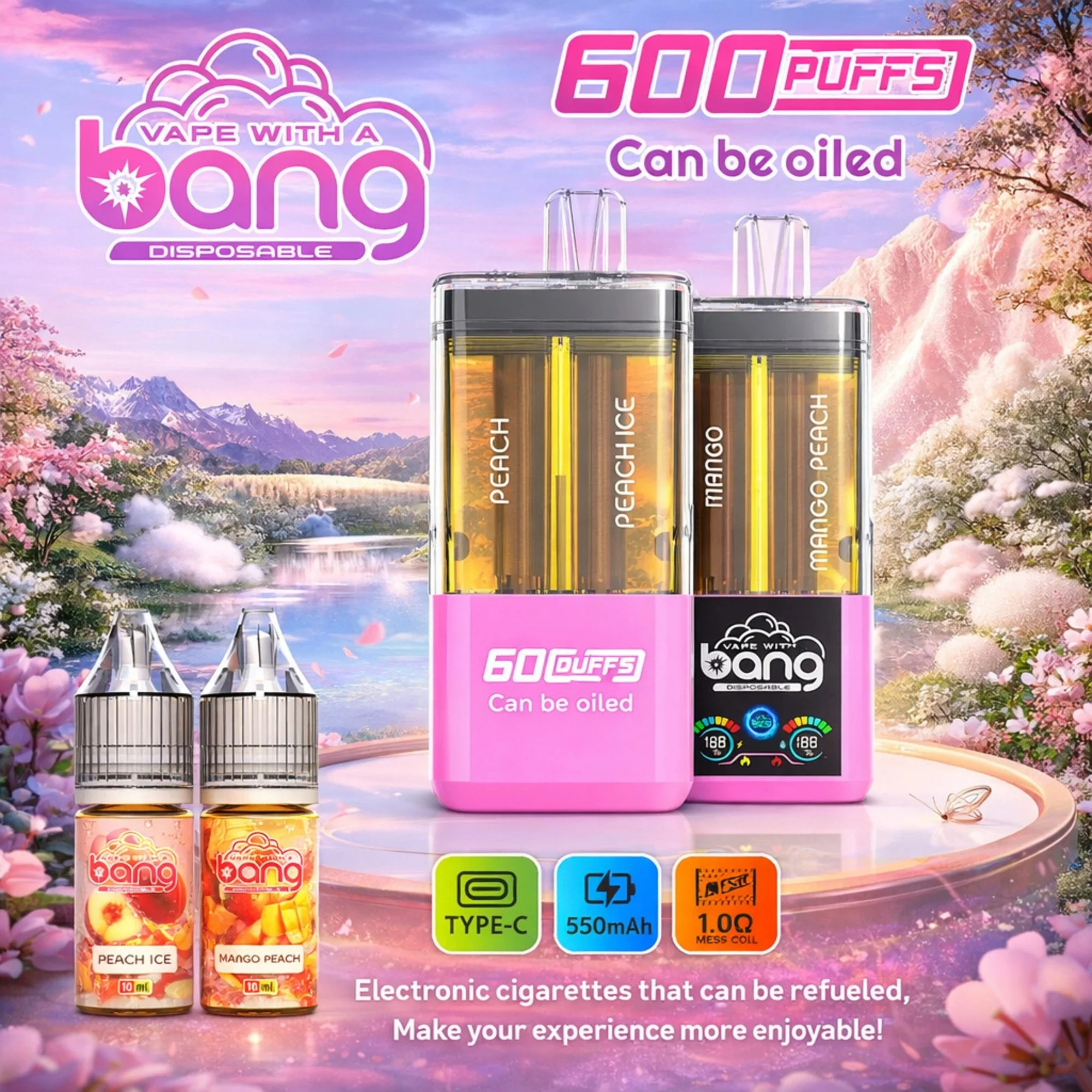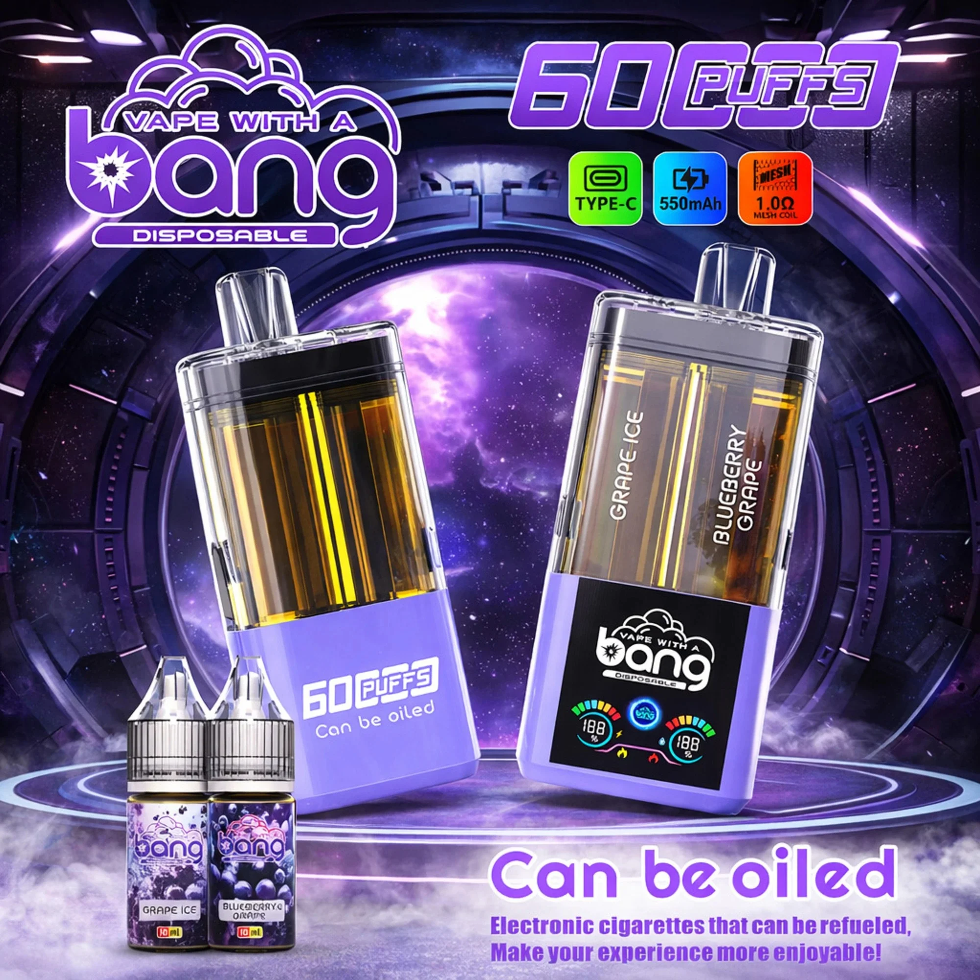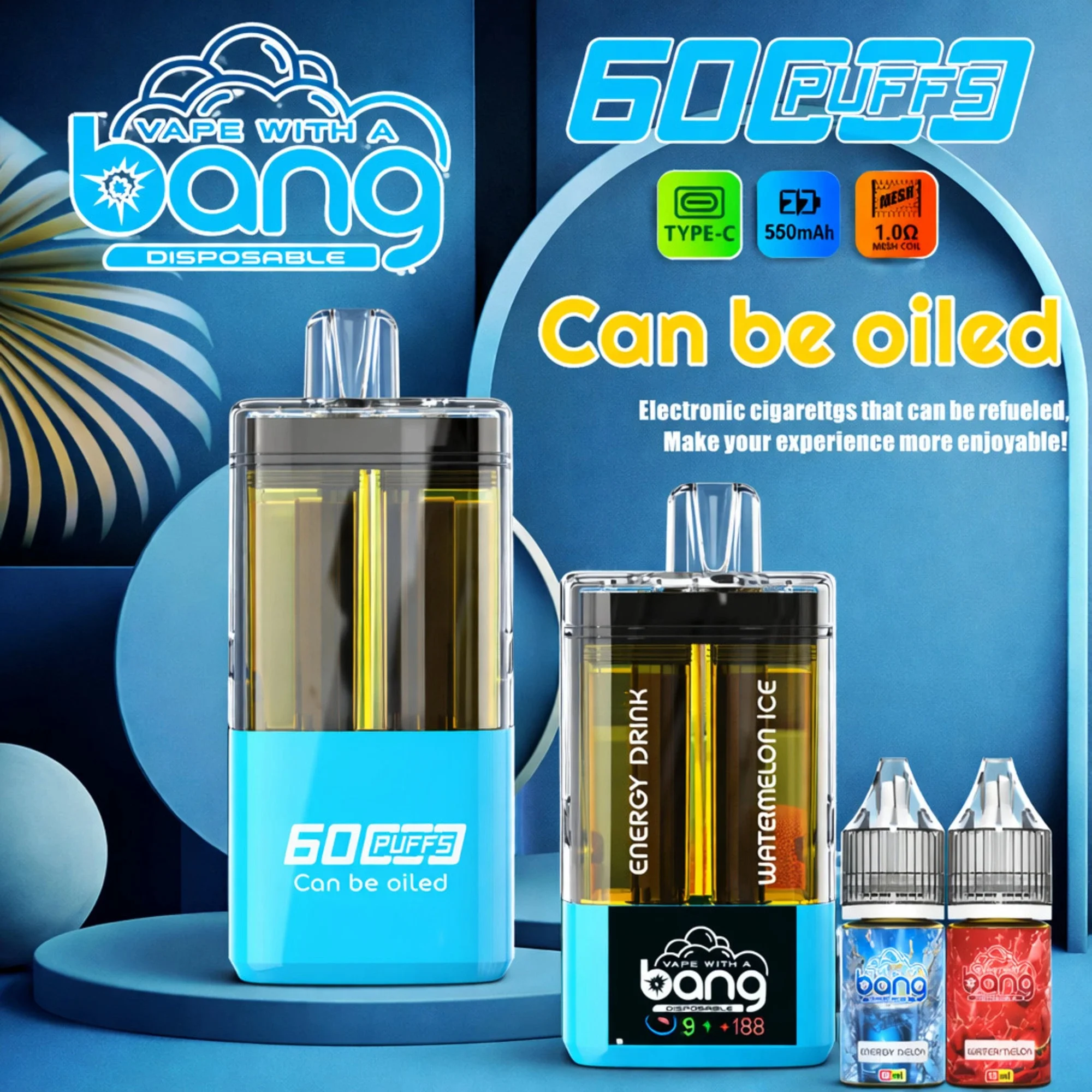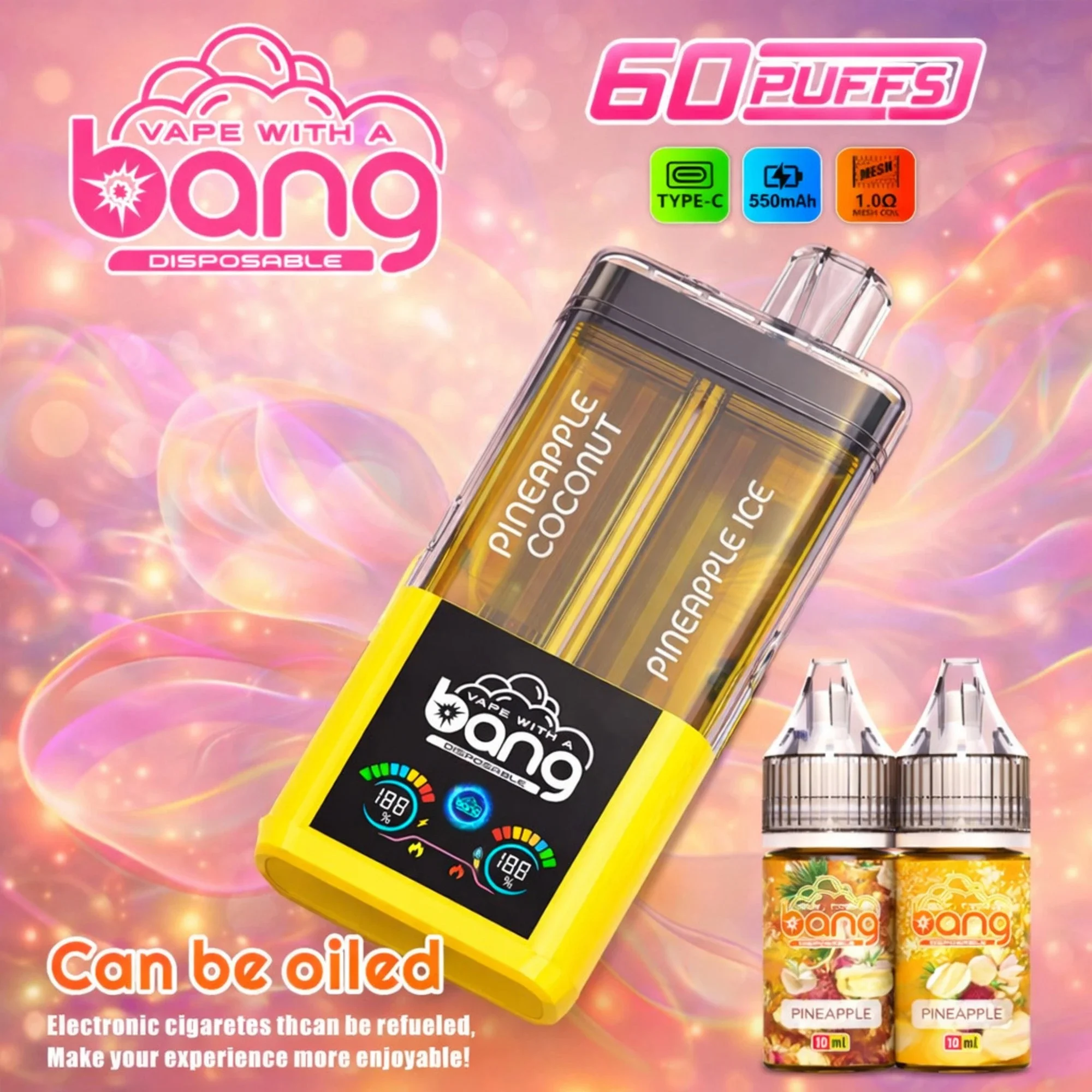 The Bang Vape 60000 Puffs Refillable is a 2-in-1 disposable vape featuring a transparent housing and an LED smart display. It uses a 1.0Ω Dual Mesh Coil and a 550mAh rechargeable battery to deliver rich flavor and big clouds. Its refillable design and easy flavor-switching make it a versatile, tech-focused choice for the European market.