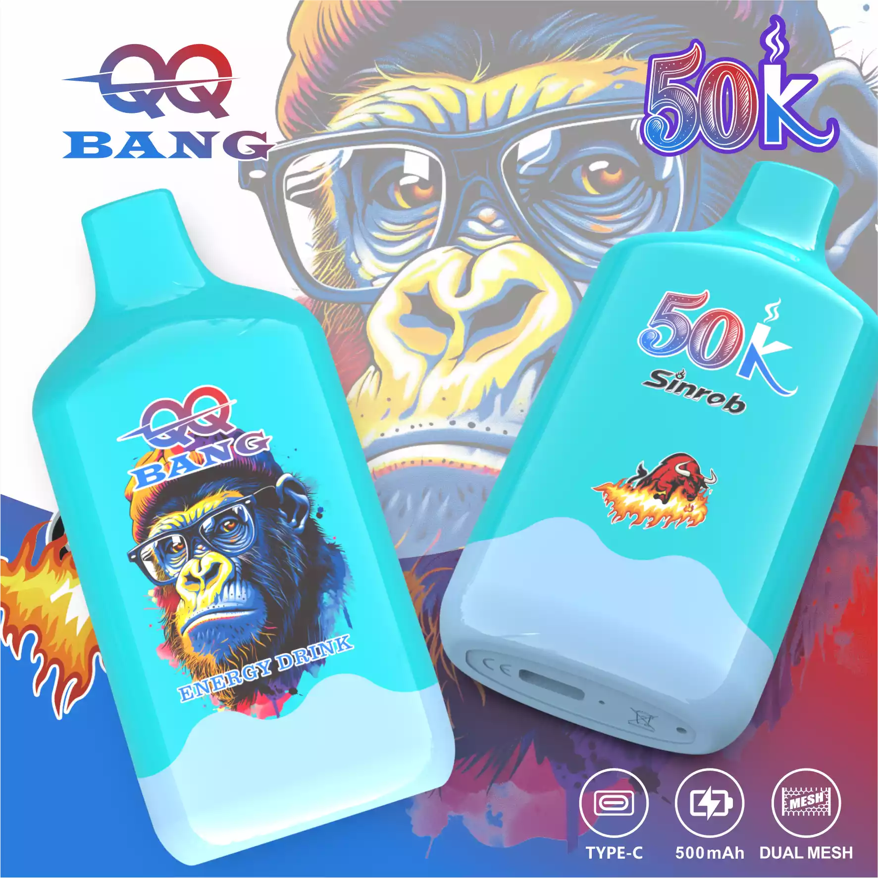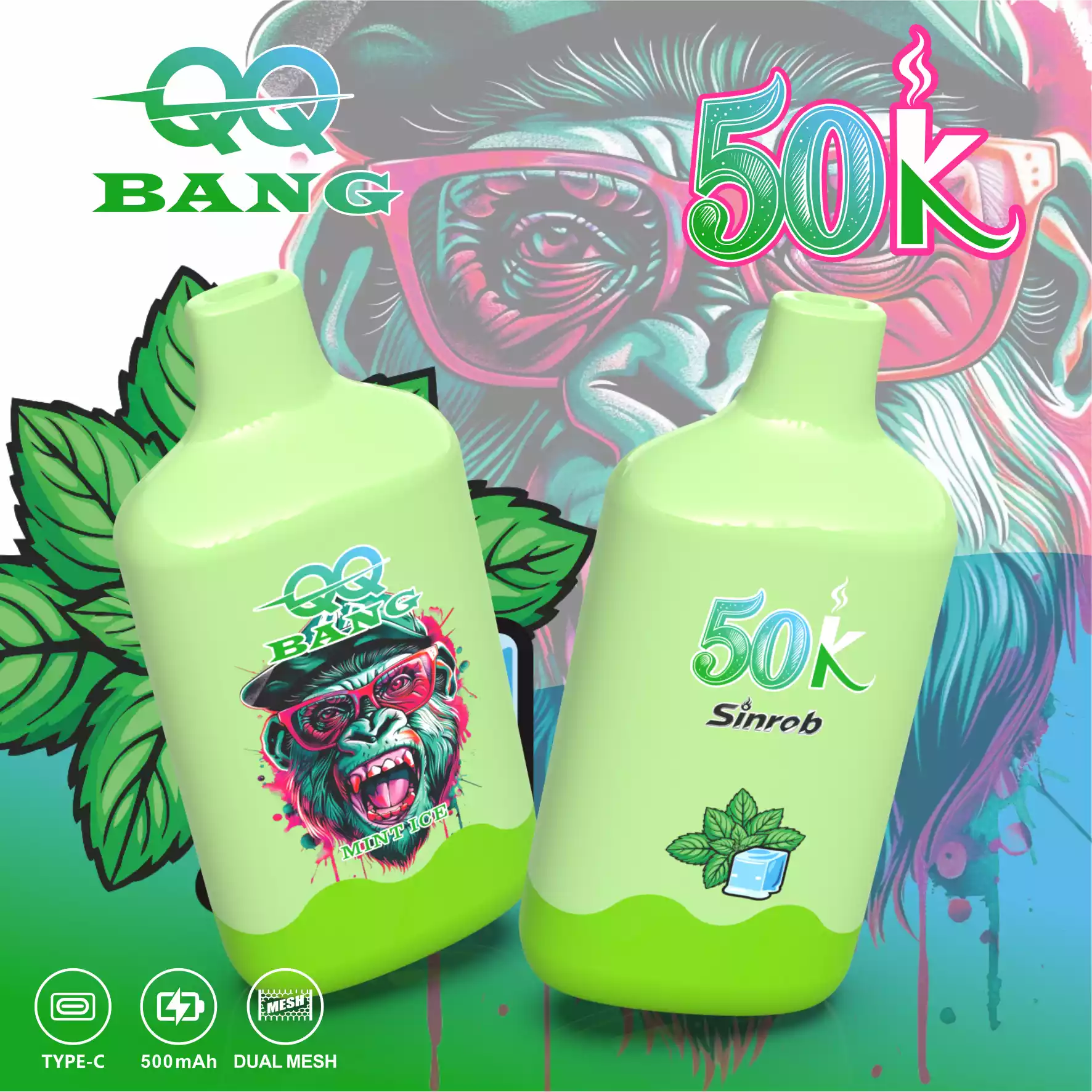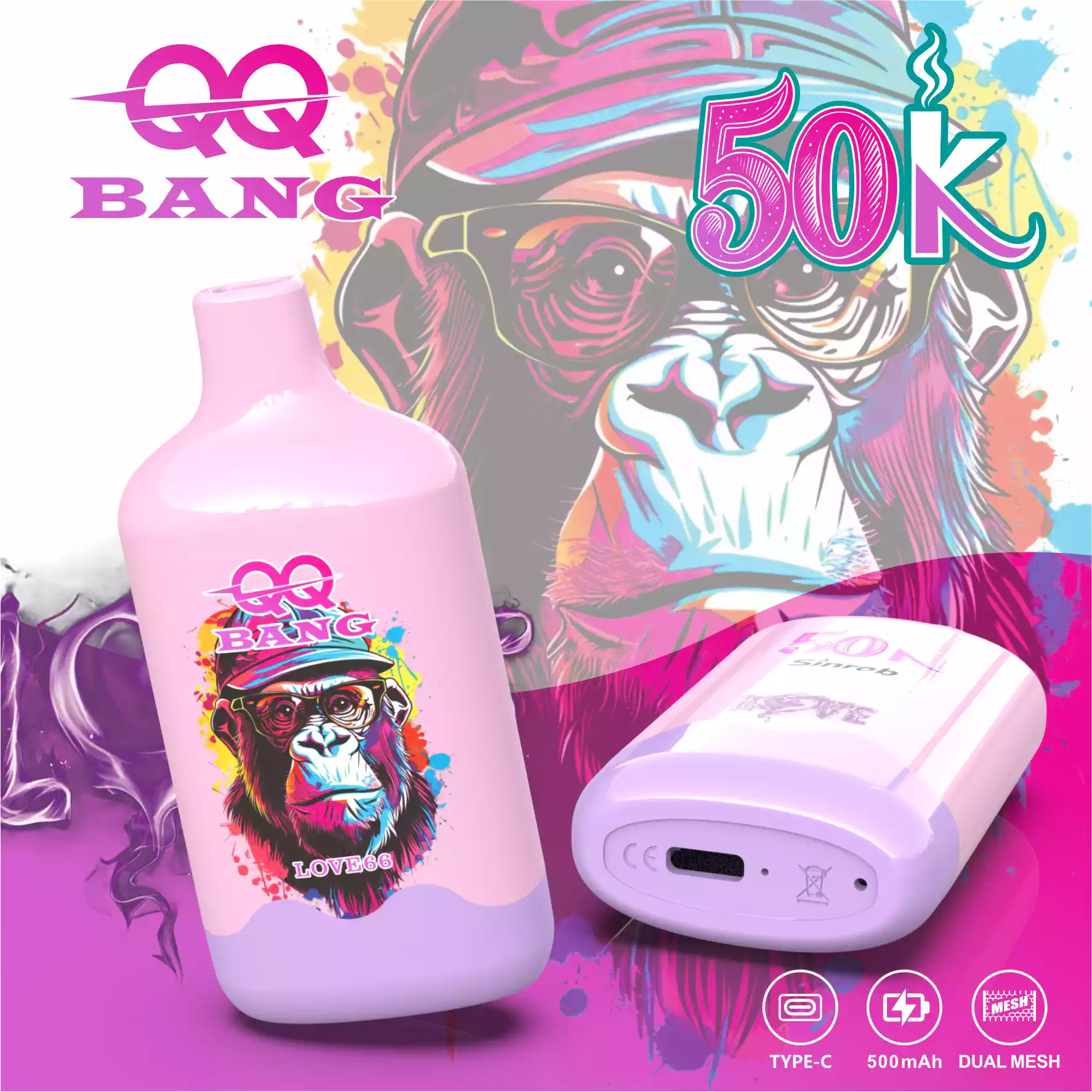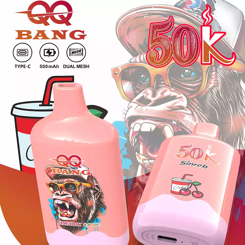 The QQ BANG 50000 Puffs is a high-capacity disposable vape featuring the popular Monkey Design. It comes pre-filled with 40ml of e-liquid and uses a 1.2Ω Mesh Coil for big clouds and rich flavor.