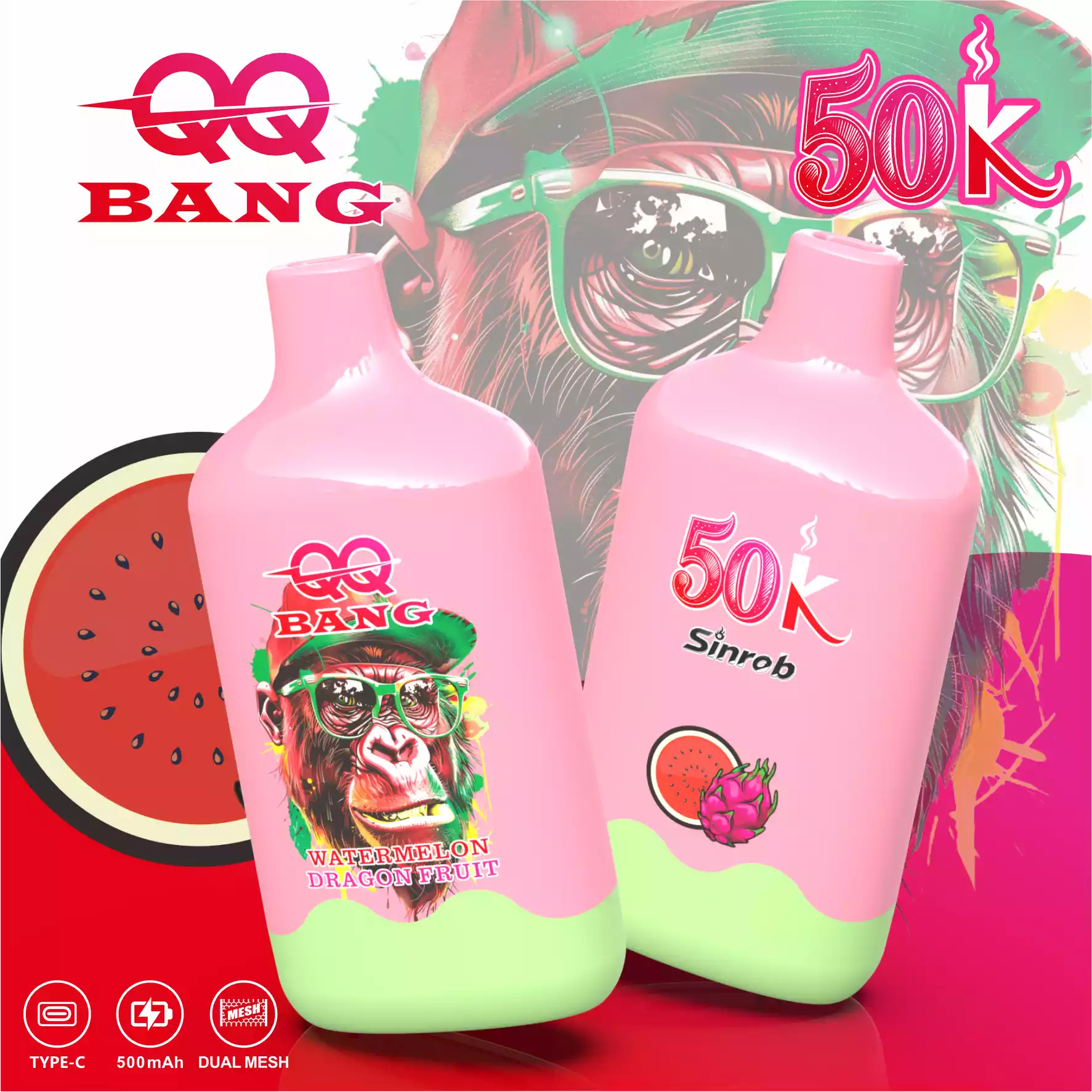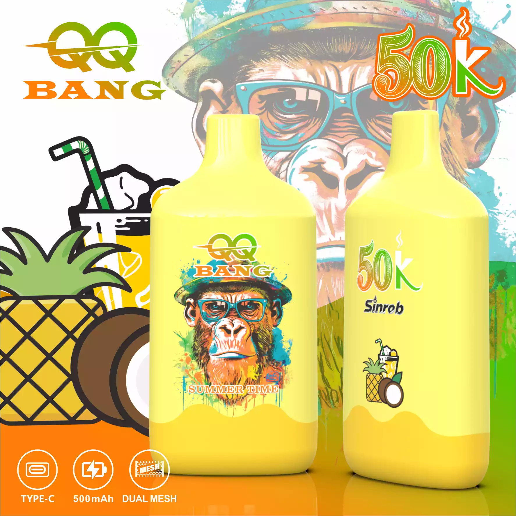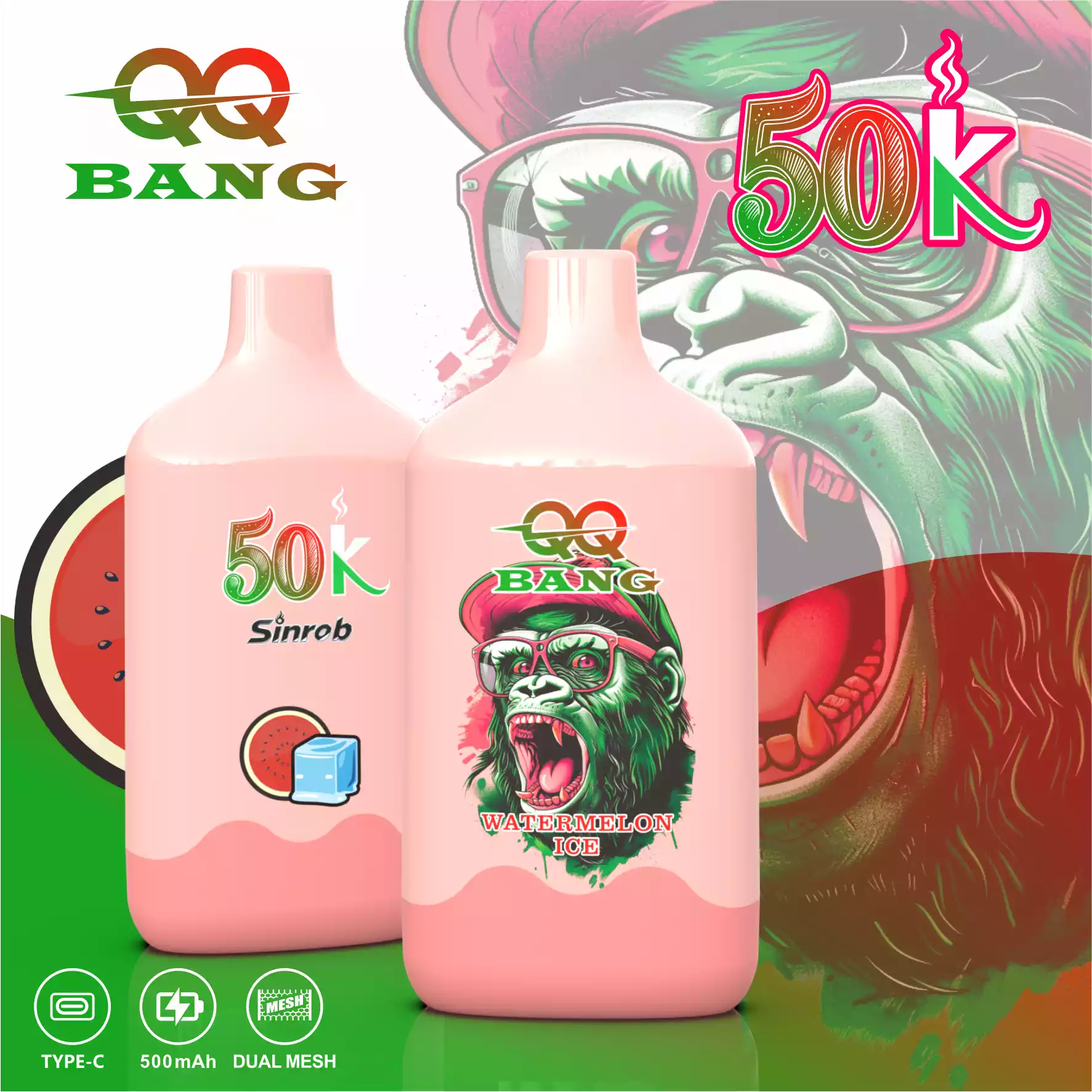 The QQ BANG 50000 Puffs is a high-capacity disposable vape featuring the popular Monkey Design. It comes pre-filled with 40ml of e-liquid and uses a 1.2Ω Mesh Coil for big clouds and rich flavor.